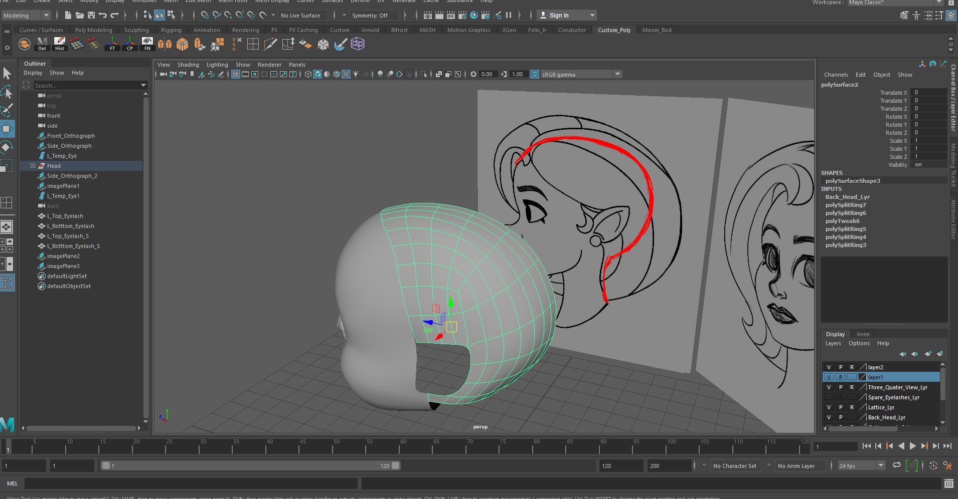 For this session I had to remodel the eyelashes to fit with the new shape of the eyelids. I then had to create the brow, and bring out the cheeks to create more volume in the face. After I had to bring back the back of the head and combine the two, and add more edge loops.